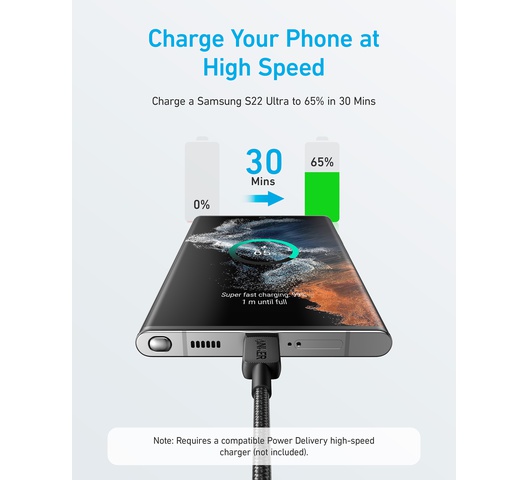 - High-Speed Charging: Charge a Samsung S23 to 55% in just 30 minutes when used with a compatible Power Delivery charger.