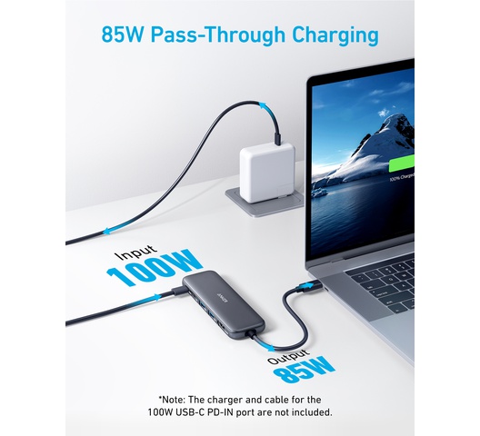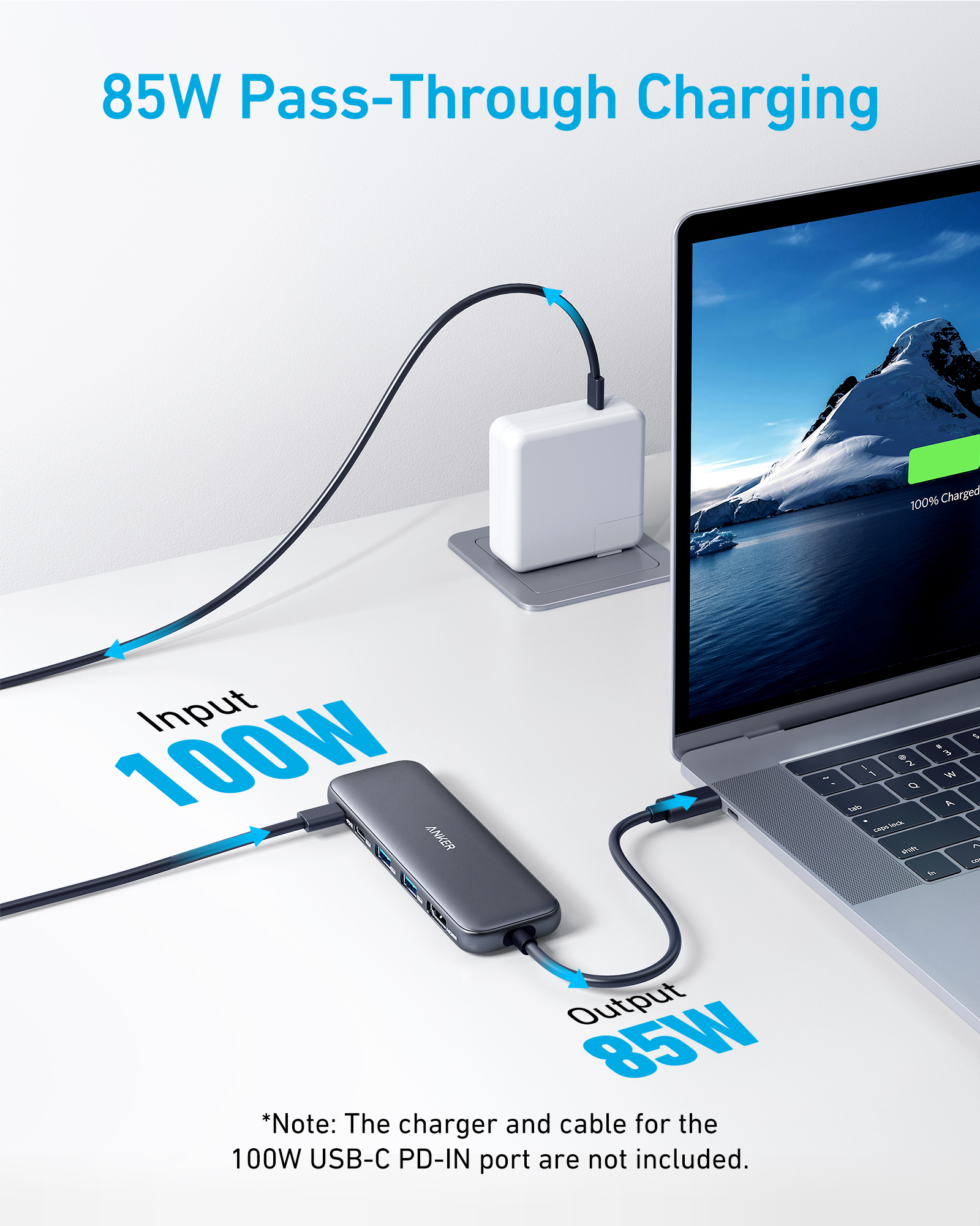 - Powerful Pass-Through Charging: Supports up to 85W pass-through charging so you can power up your laptop while you use the hub. Note: Pass-through charging requires a charger (not included).