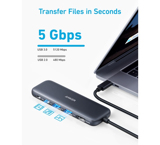 - Transfer Files in Seconds: Move files to and from your laptop at speeds of up to 5 Gbps via the USB-C and USB-A data ports.