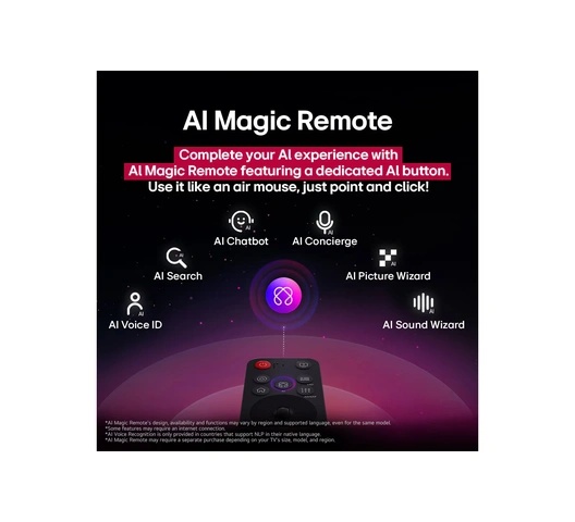 - AI Magic Remote completes the AI experience - With a motion sensor and scroll wheel, point and click to use it like an air mouse or simply speak for voice commands. webOS smart features, including AI Search, AI Picture Wizard, Google Cast* & Apple AirPlay*