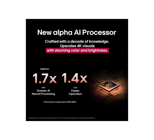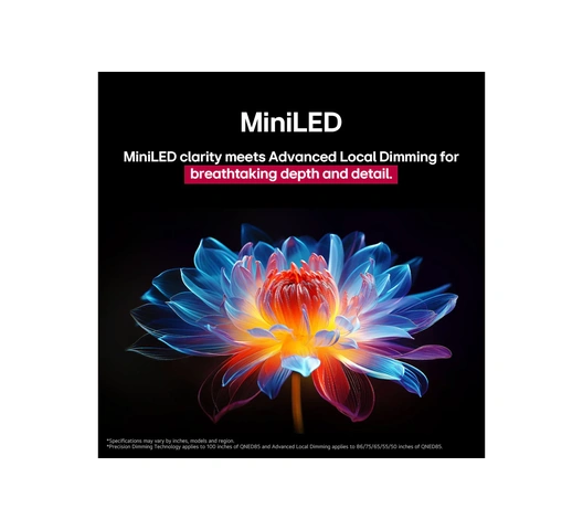 - MiniLED with Advanced Local Dimming & 100% Color Volume - MiniLED powered by New alpha AI Processor makes ultra-sharp contrast and lifelike detail on LG QNED evo.