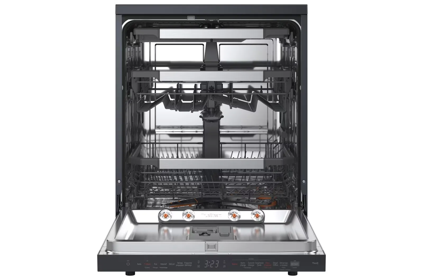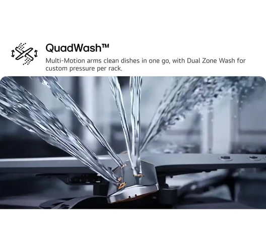 - Quad Wash: Four-arm system that uses multi-motion and rotating arms to spray water from multiple angles, ensuring thorough cleaning and reaching every corner.