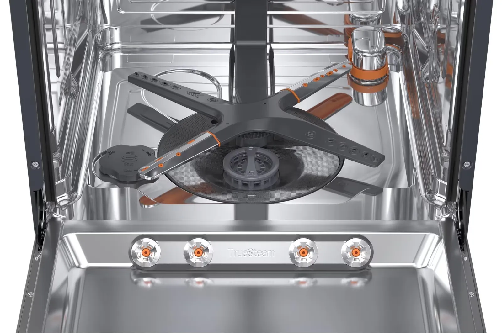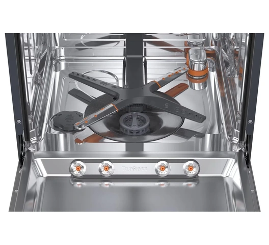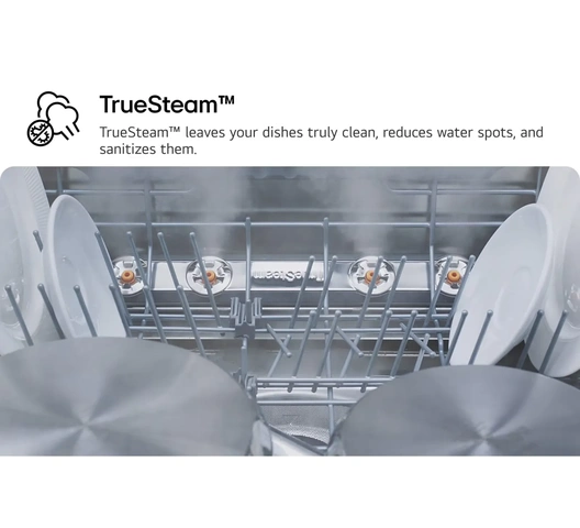 - True Steam - Sanitizing steam cycle that eliminates 99.9% of bacteria and reduces water spots, leaving dishes shiny.